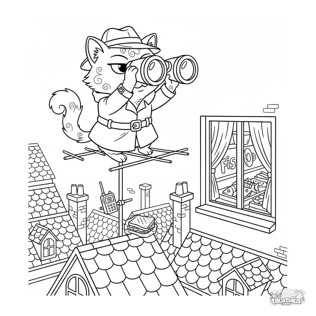 Página para colorir para crianças 10-12: um gato espião confiante de trench coat usa binóculos em uma antena de telhado para observar uma peixaria. Cena engraçada detalhada.