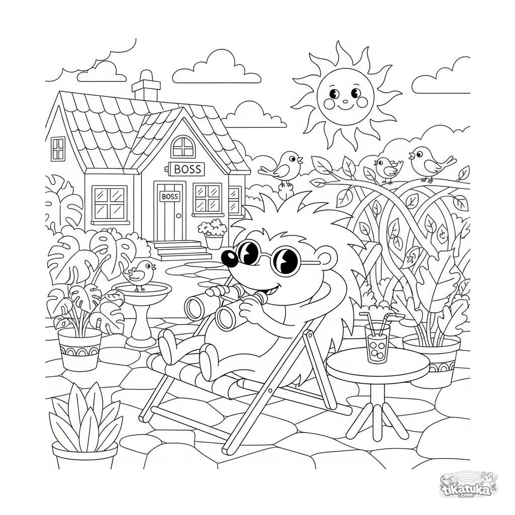 Página para colorir engraçada em estilo retrô: um ouriço confiante com óculos de sol relaxa em uma espreguiçadeira com binóculos, procurando o dia do pagamento. Cena detalhada de varanda.