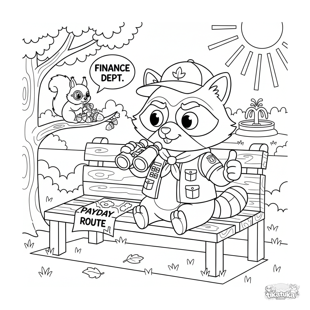 Página para colorir para crianças mais velhas: um guaxinim batedor confiante em um banco de parque, explorando o salário com binóculos. Meme engraçado com mapa, esquilo contador e muitos detalhes.