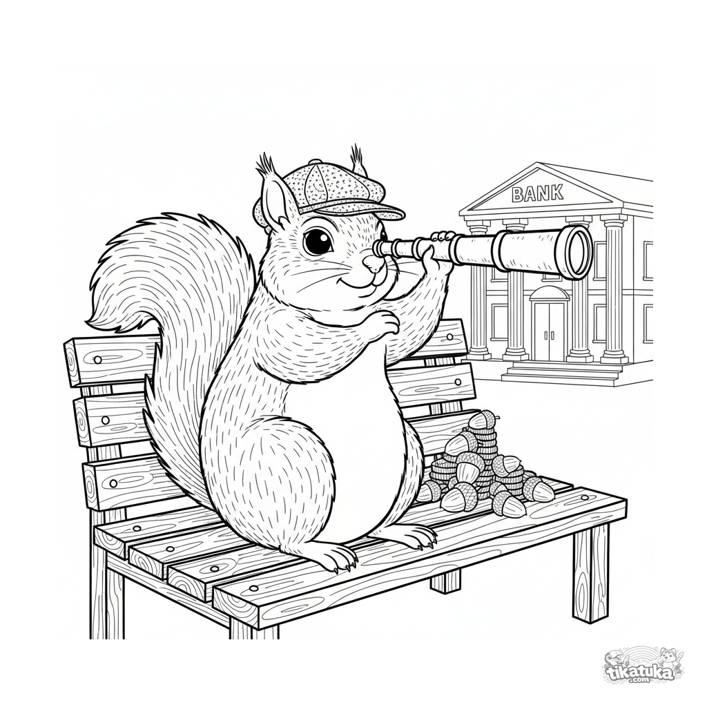 Página para colorir para crianças 10-12: um esquilo confiante no banco do parque com telescópio, procurando seu salário no banco. Cena realista e detalhada.
