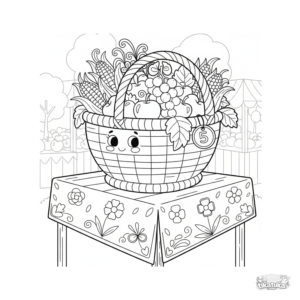 Página para colorir de cesta cornucópia transbordando em barraca de mercado. Para crianças 4-6. Estilo folclórico lubok brilhante.