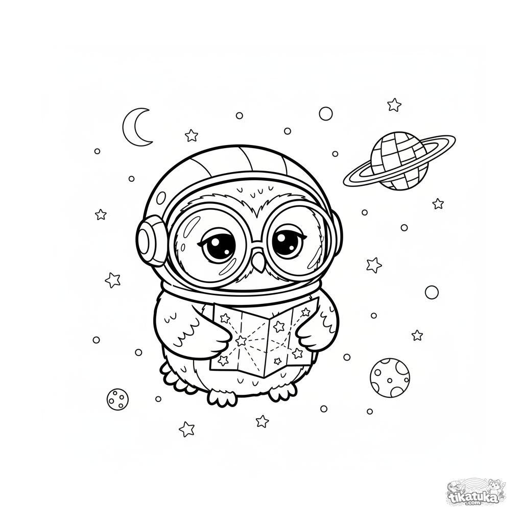 Página para colorir para crianças 4-6: a fofa corujinha bibliotecária Owl Oof como astronauta flutuando no espaço sideral com um mapa estelar. Linhas simples, estilo de pelúcia escandinavo.