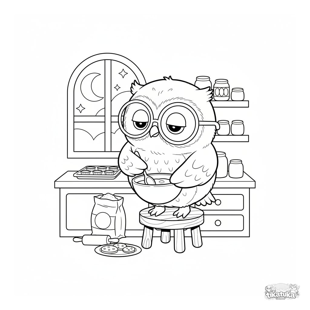 Página para colorir para crianças 4-6: a fofa coruja bibliotecária Oof assando cupcakes em uma minicozinha aconchegante. Linhas simples, estilo de pelúcia escandinavo.