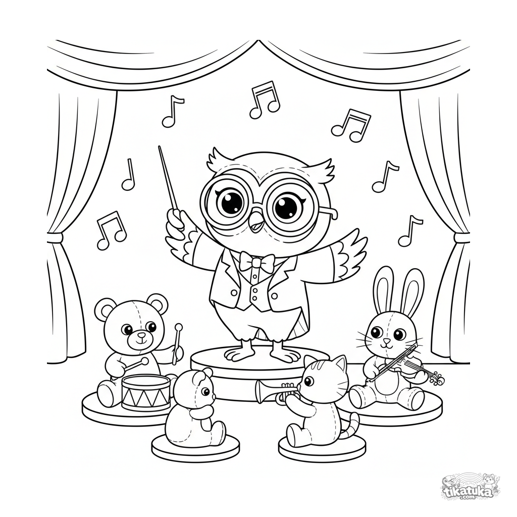 Página para colorir para crianças 4-6: A coruja Oof rege uma orquestra de brinquedos de animais de pelúcia. Cena dinâmica e alegre com notas musicais.