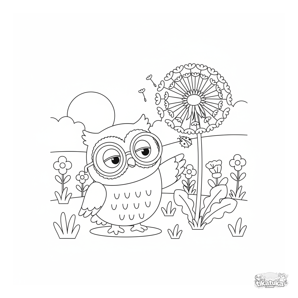 Página para colorir para crianças: a corujinha Oof com óculos grandes explora um dente-de-leão gigante em um prado ensolarado. Cena da natureza adorável, adequada para 4-6 anos.