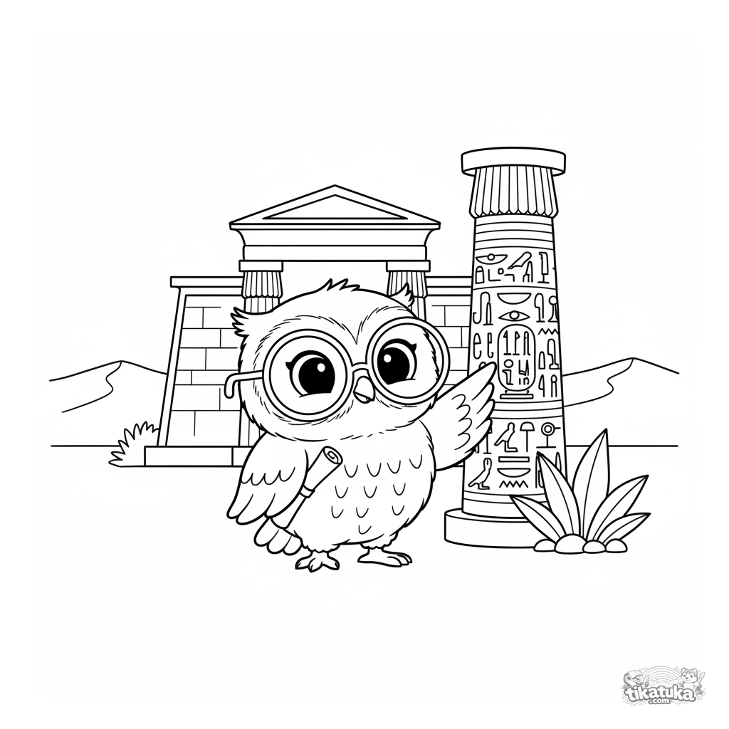 Página para colorir para crianças 4-6: a coruja Oof explora um antigo templo egípcio. Formas geométricas simples no estilo de brinquedo de madeira, linhas limpas, tema educativo.