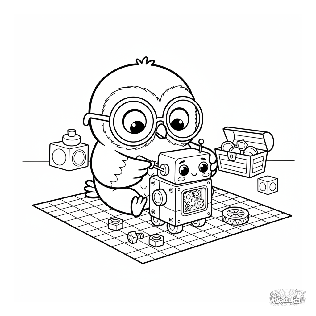 Página para colorir para crianças: a corujinha Oof, a pequena mecânica, conserta um robô de brinquedo quebrado. Cena de oficina com ferramentas, adequada para 4-6 anos.
