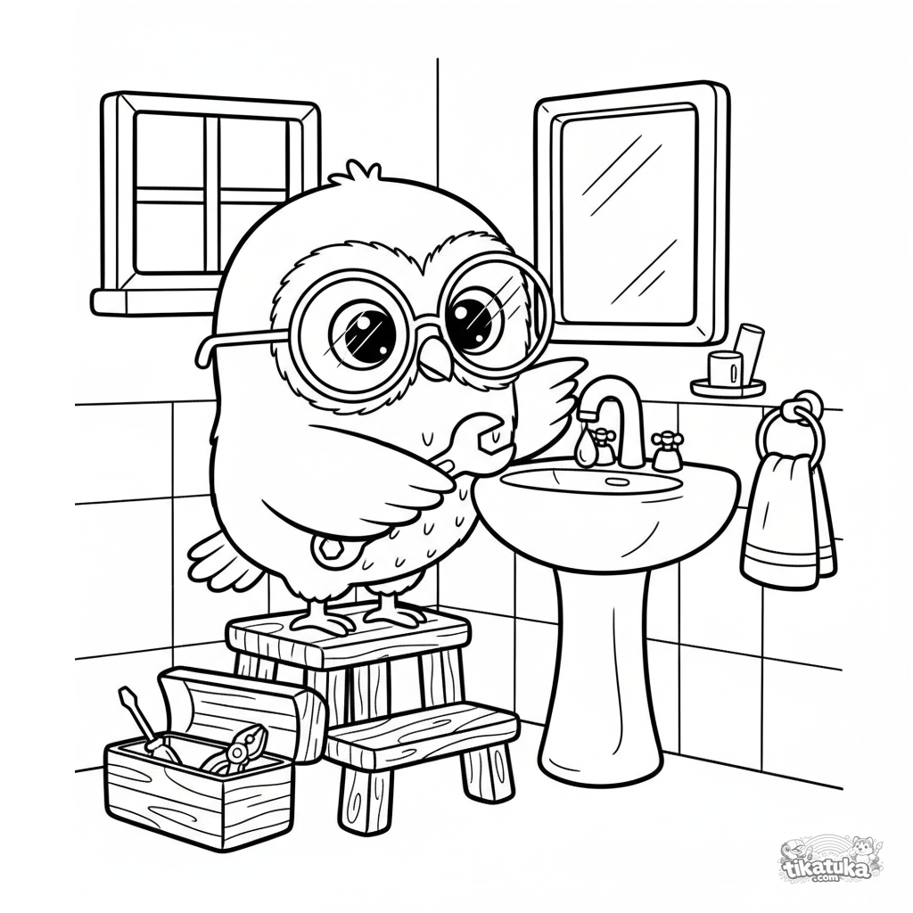 Página para colorir para crianças 4-6: a coruja Oof trabalha como encanadora consertando uma torneira com vazamento. Formas geométricas no estilo de brinquedo de madeira, linhas limpas, tema educativo de profissões.