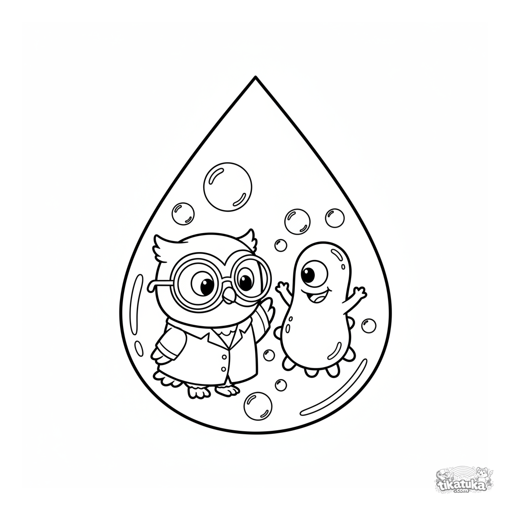 Página para colorir com a Coruja Oof de jaleco observando um germe amigável dentro de uma gota d'água. Para crianças de 4 a 6 anos.