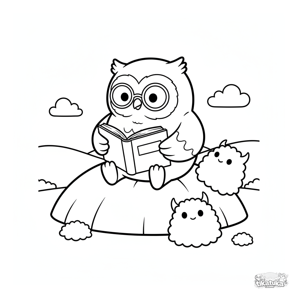 Página para colorir para crianças: a fofa coruja Oof lê um livro para monstros nuvem fofos e amigáveis em uma colina macia. Estilo de boneco de pano, personagens gentis.