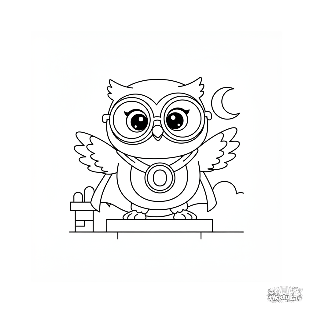Página para colorir para crianças 4-6: a corujinha Oof como super-herói com uma capa esvoaçante, pronta para voar. Design estilo mascote de pelúcia.