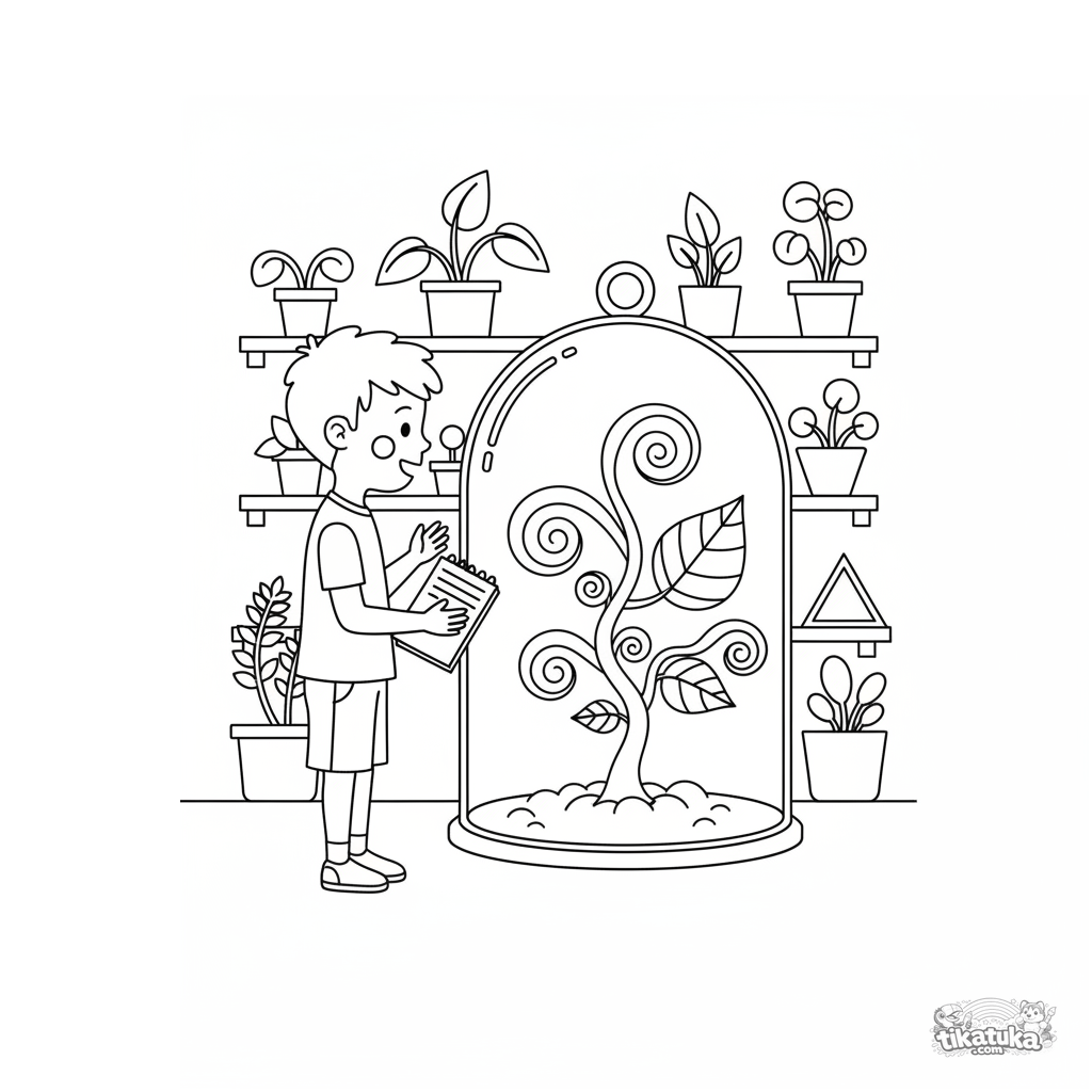 Página para colorir para crianças de 7-9 anos no estilo de recorte de papel: um menino estuda uma planta estranha em um laboratório secreto.