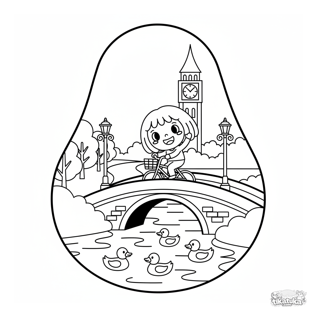Página para colorir para crianças 4-6: uma bela ponte de pedra sobre um rio, um ciclista feliz chegando à cidade. Silhuetas estilo recorte de papel, margens amplas.