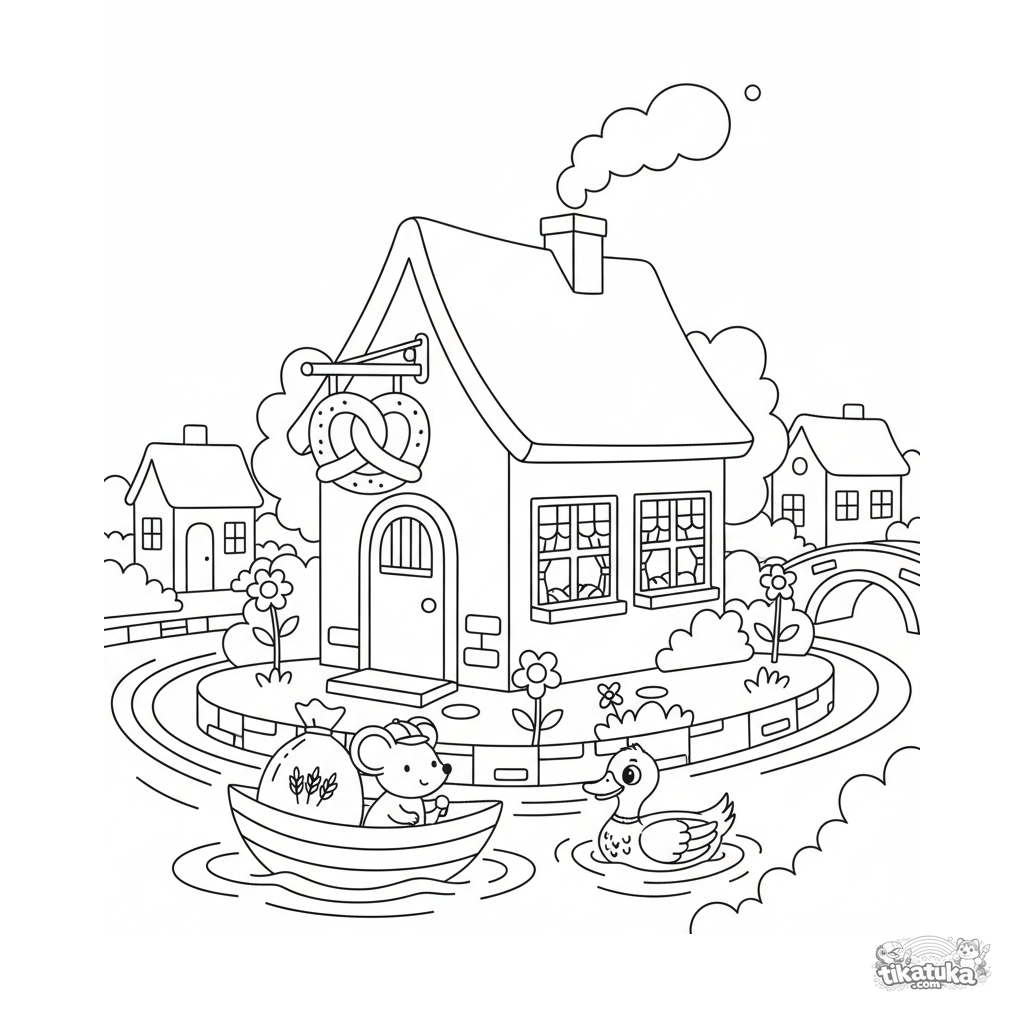 Página para colorir para crianças: uma padaria aconchegante no canal e um rato entregador em um barco de folha. Contornos limpos estilo recorte de papel, muitos detalhes fofos.