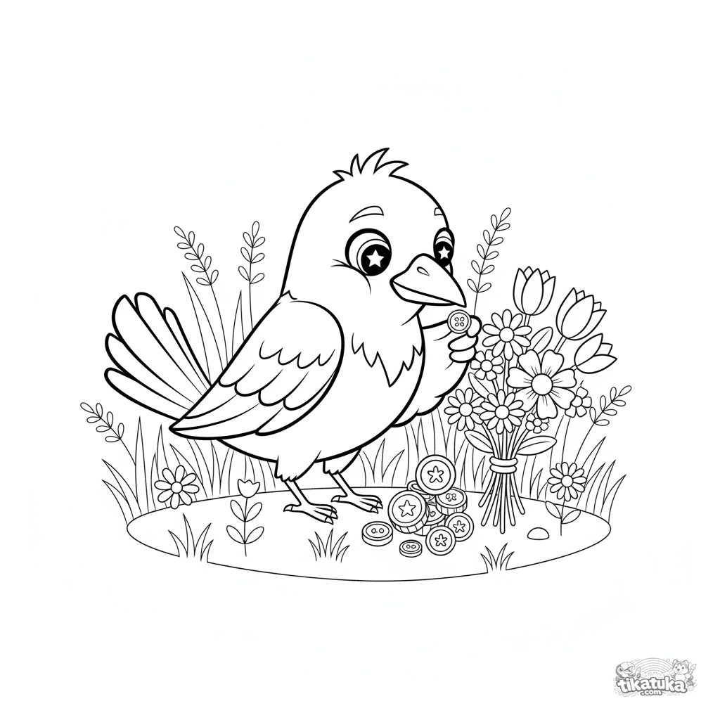 Página para colorir para crianças mais velhas: um corvo ajudando a organizar tesouros brilhantes em um prado florido. Arte estilo recorte de papel detalhada, para 6-9 anos.