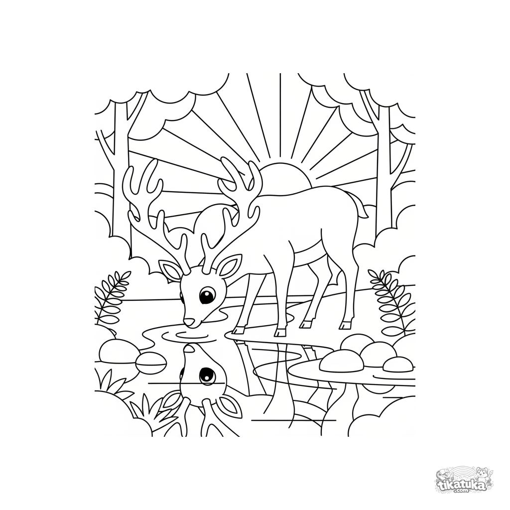 Página para colorir para crianças 4-6 no estilo papel cortado: um veado com galhadas ramificadas bebe de um riacho. Silhuetas gráficas, reflexo na água e raios de sol estilizados.