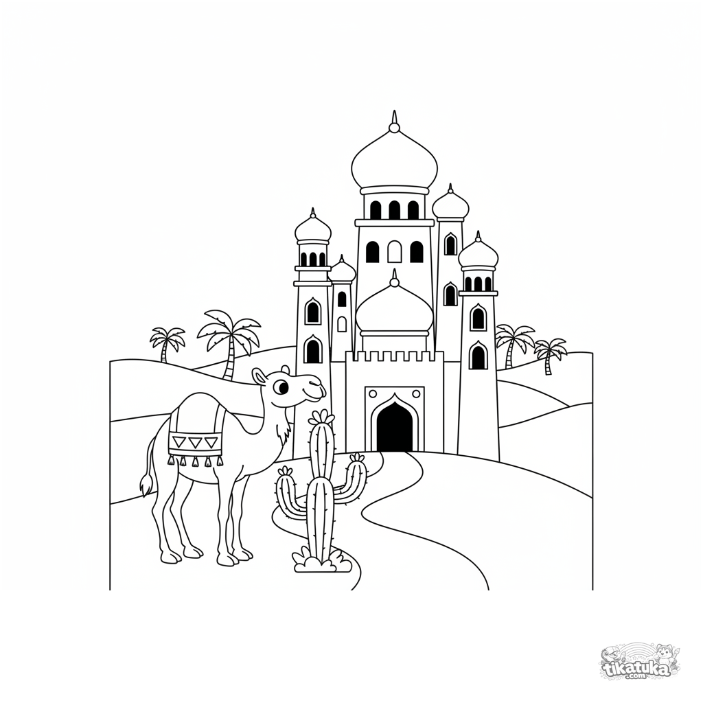 Página para colorir para crianças 4-6: um palácio de conto de fadas no deserto e um camelo explorando um cacto. Silhuetas estilo recorte de papel, margens amplas.