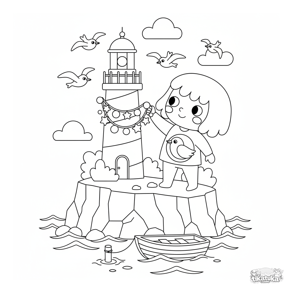 Página para colorir para crianças de 4-6 anos no estilo de recorte de papel: um guardião decora um farol listrado num penhasco. Silhuetas claras e formas simples.