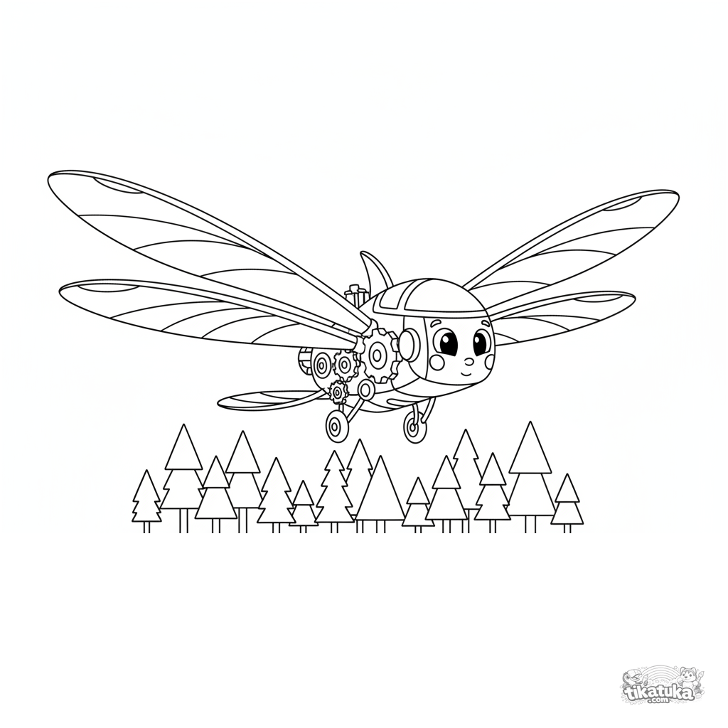 Página para colorir de um ornitóptero fantástico no estilo de recorte de papel. Para crianças de 4 a 6 anos. Formas geométricas nítidas, design mecânico interessante.