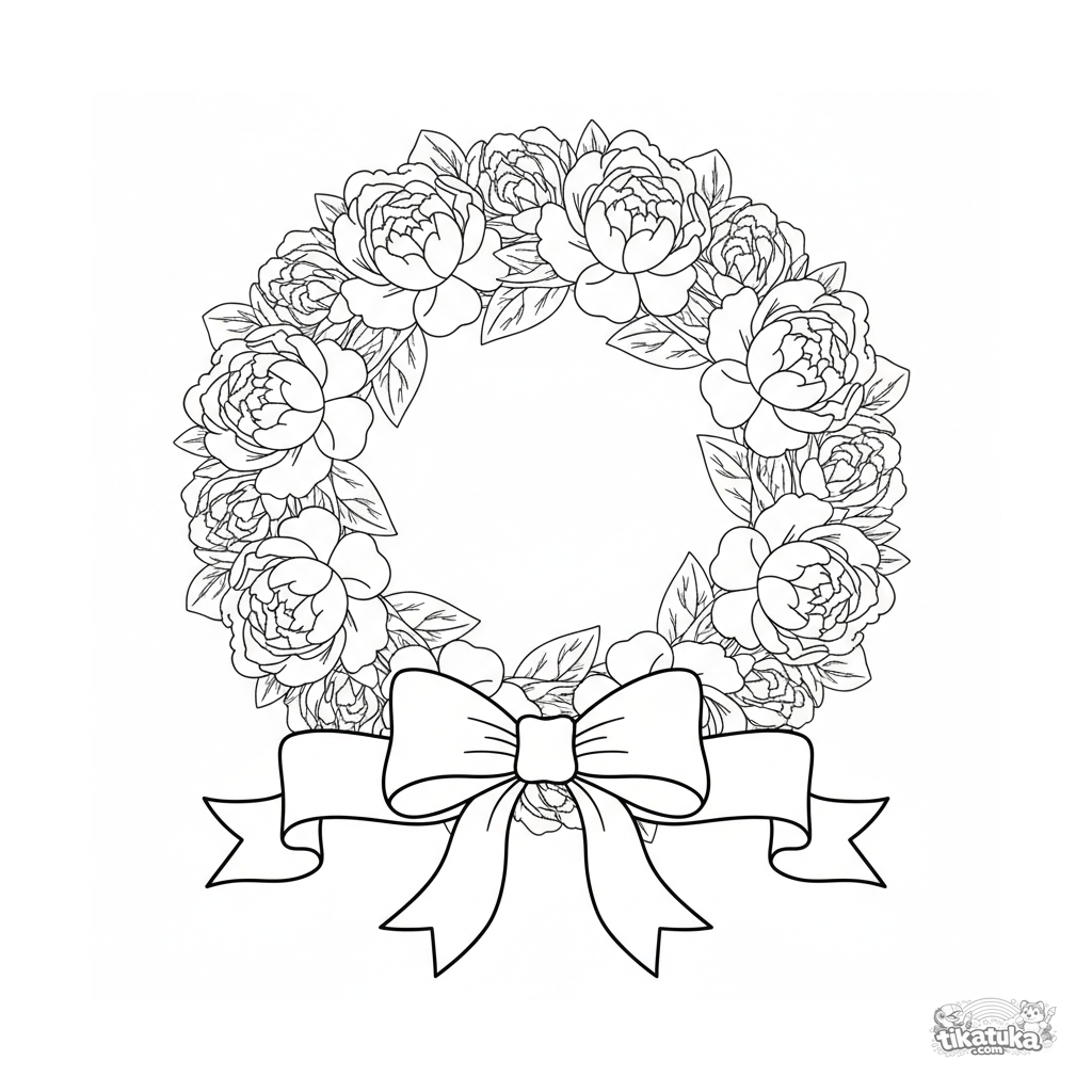 Página para colorir para crianças 7-9: uma grinalda decorativa de peônias em estilo papel cortado com fita. Contornos nítidos.