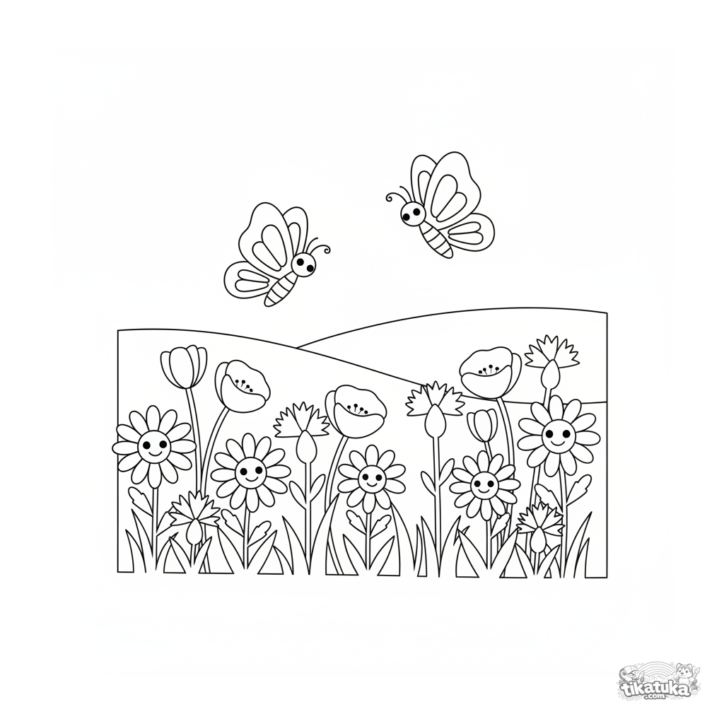 Página para colorir para 7-9 anos no estilo de recorte de papel: silhuetas de margaridas, papoulas e centáureas em um campo com borboletas.