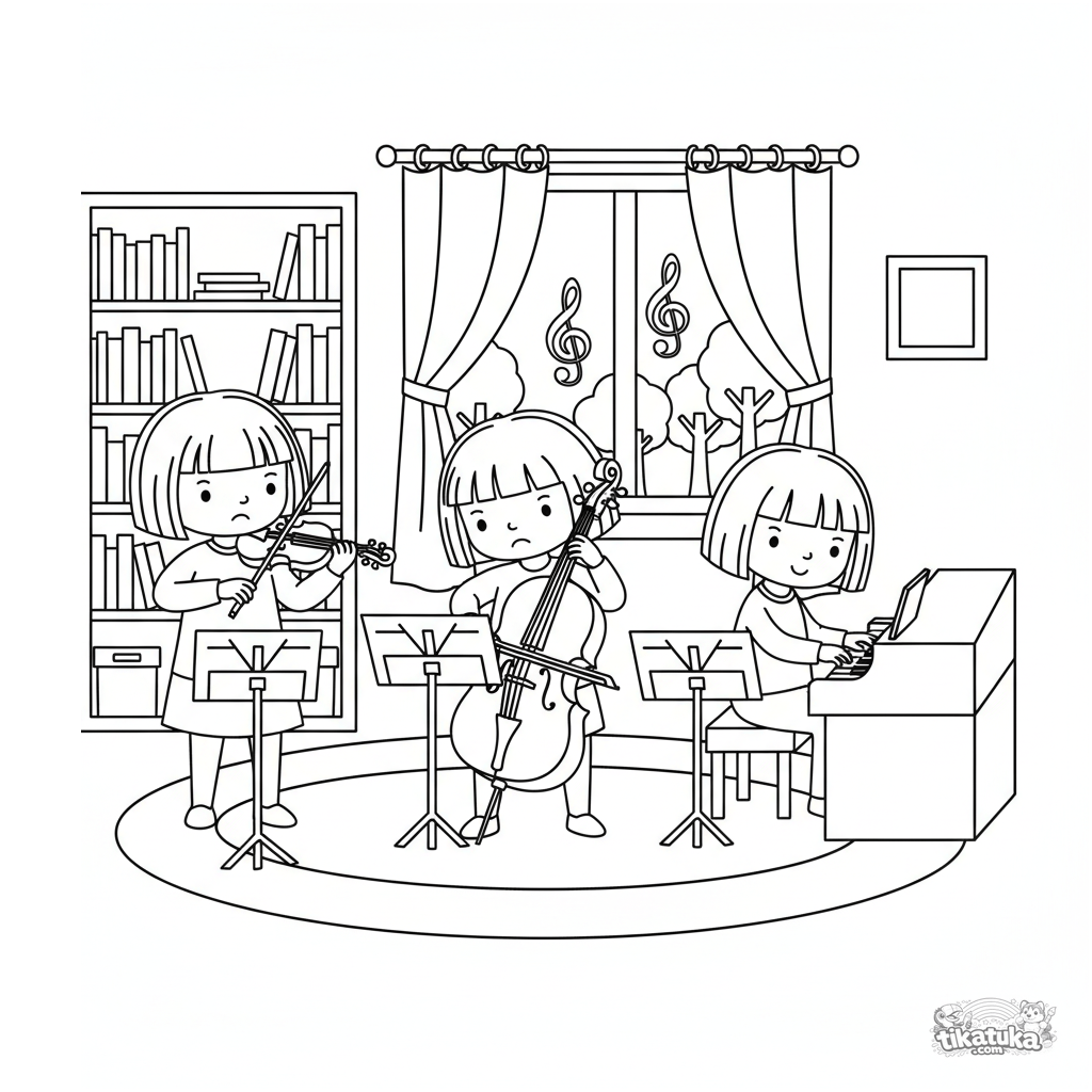 Página para colorir para crianças 5-8: um trio de músicos no estilo de recorte de papel toca em uma sala aconchegante.