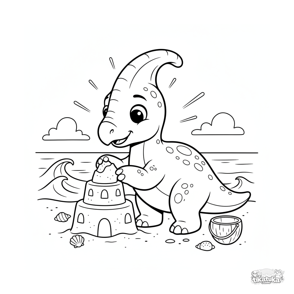 Página para colorir para crianças de 4-6 anos: um parasaurolophus construindo um castelo de areia em uma praia oceânica antiga.