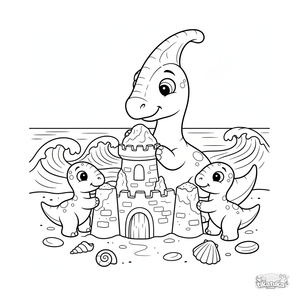 Página para colorir para crianças de 4-6 anos: uma família de dinossauros parasaurolophus construindo um castelo de areia na praia de um oceano antigo.