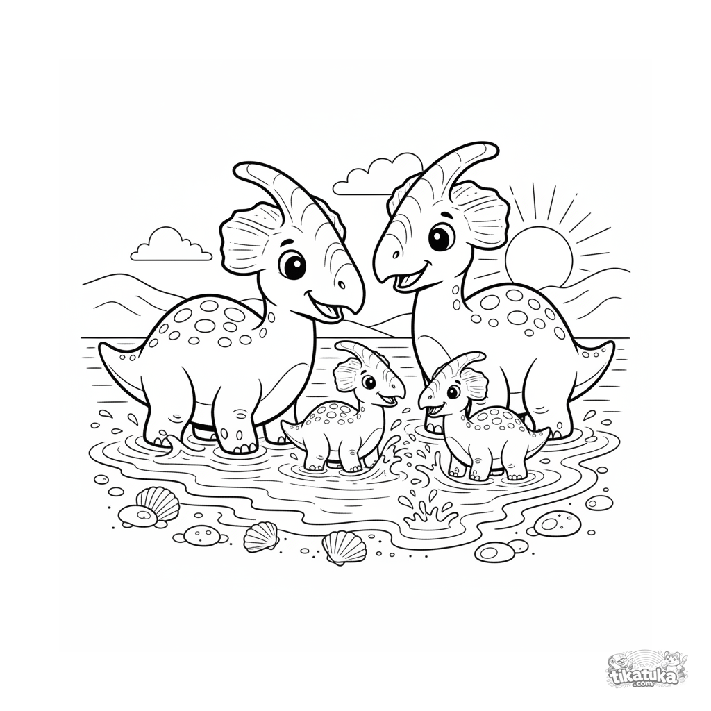 Página para colorir para crianças de 4-6 anos: uma família de dinossauros parasaurolophus na praia arenosa de um oceano antigo.