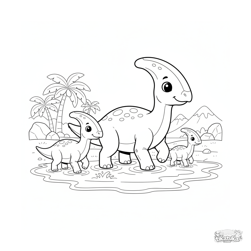 Página para colorir para crianças de 4-6 anos: uma família de dinossauros parasaurolofo passeia pela beira d'água em uma praia arenosa oceânica antiga. Detalhe moderado, formas claras.