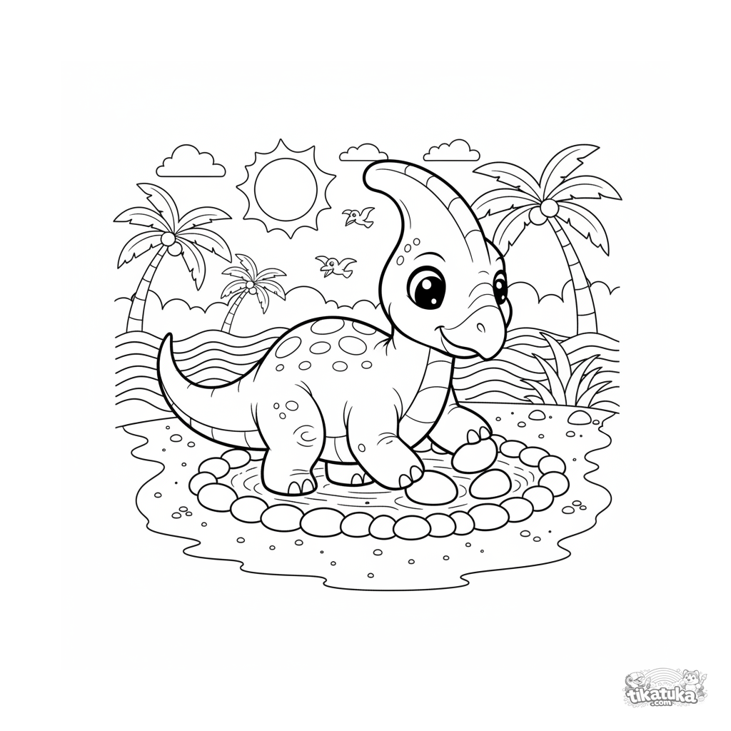 Página para colorir para crianças 4-6: um parasaurolophus arrumando pedras ao redor de seu ninho na praia de um oceano antigo.