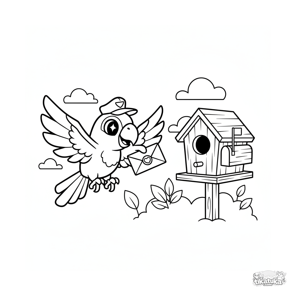 Página para colorir para crianças 4-6: um papagaio alegre com chapéu de carteiro voa com uma carta em direção a uma casa de pássaros de madeira. Estilo cartoon dos anos 80.