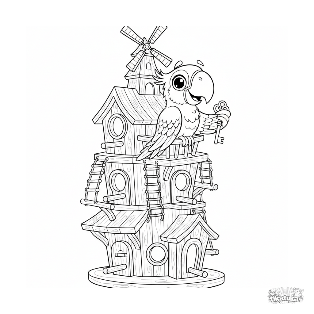 Página para colorir complexa para crianças mais velhas de 10 a 12 anos: um papagaio vibrante espiando da varanda de um caprichoso castelo-casa de pássaros de vários andares.