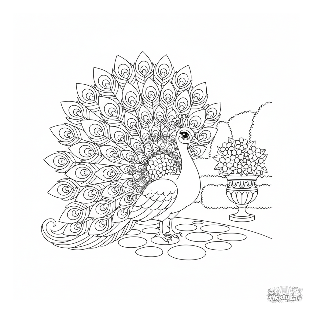 Página para colorir para crianças mais velhas: um pavão majestoso abre sua cauda padronizada em um jardim. Cena detalhada com caminho de pedra e sebes.