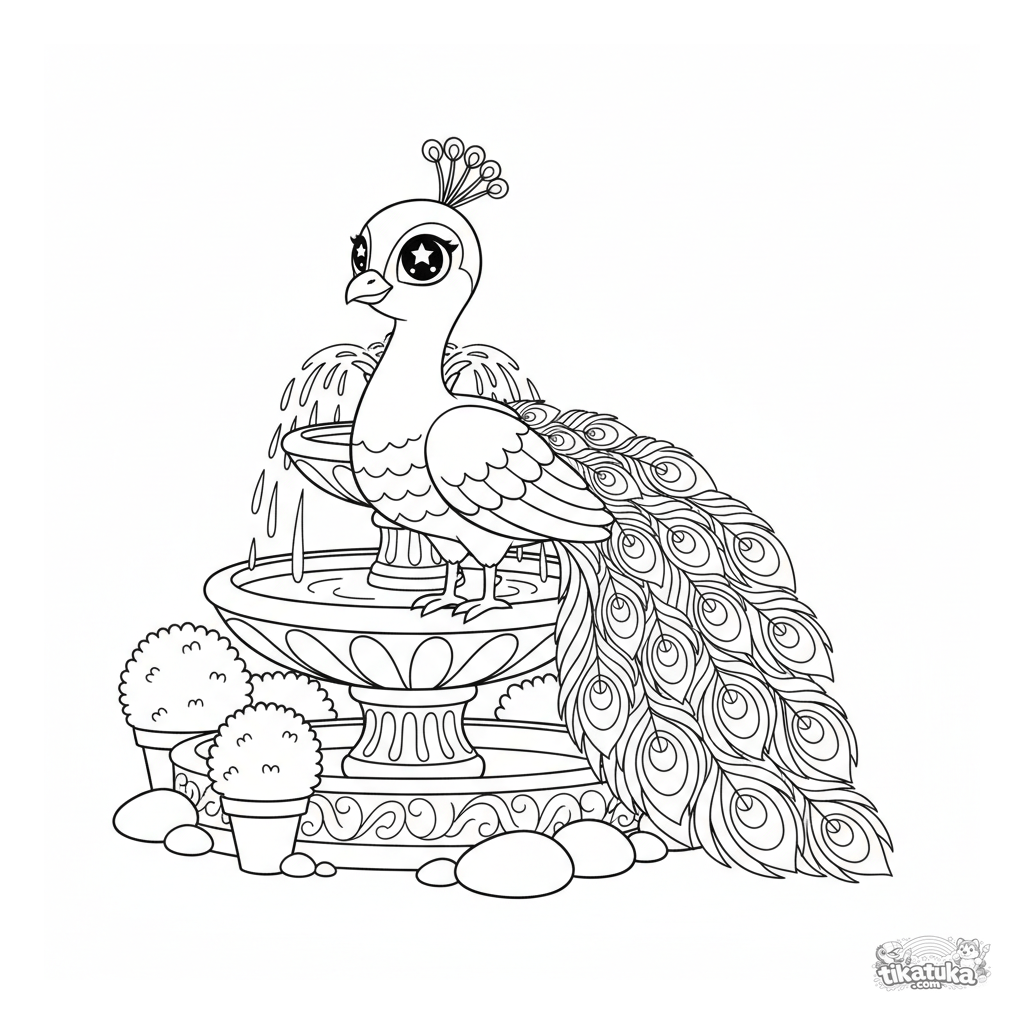 Página para colorir para crianças mais velhas (7-12): um majestoso pavão exibe sua cauda junto a uma fonte de jardim. Arte linear detalhada no estilo chibi.