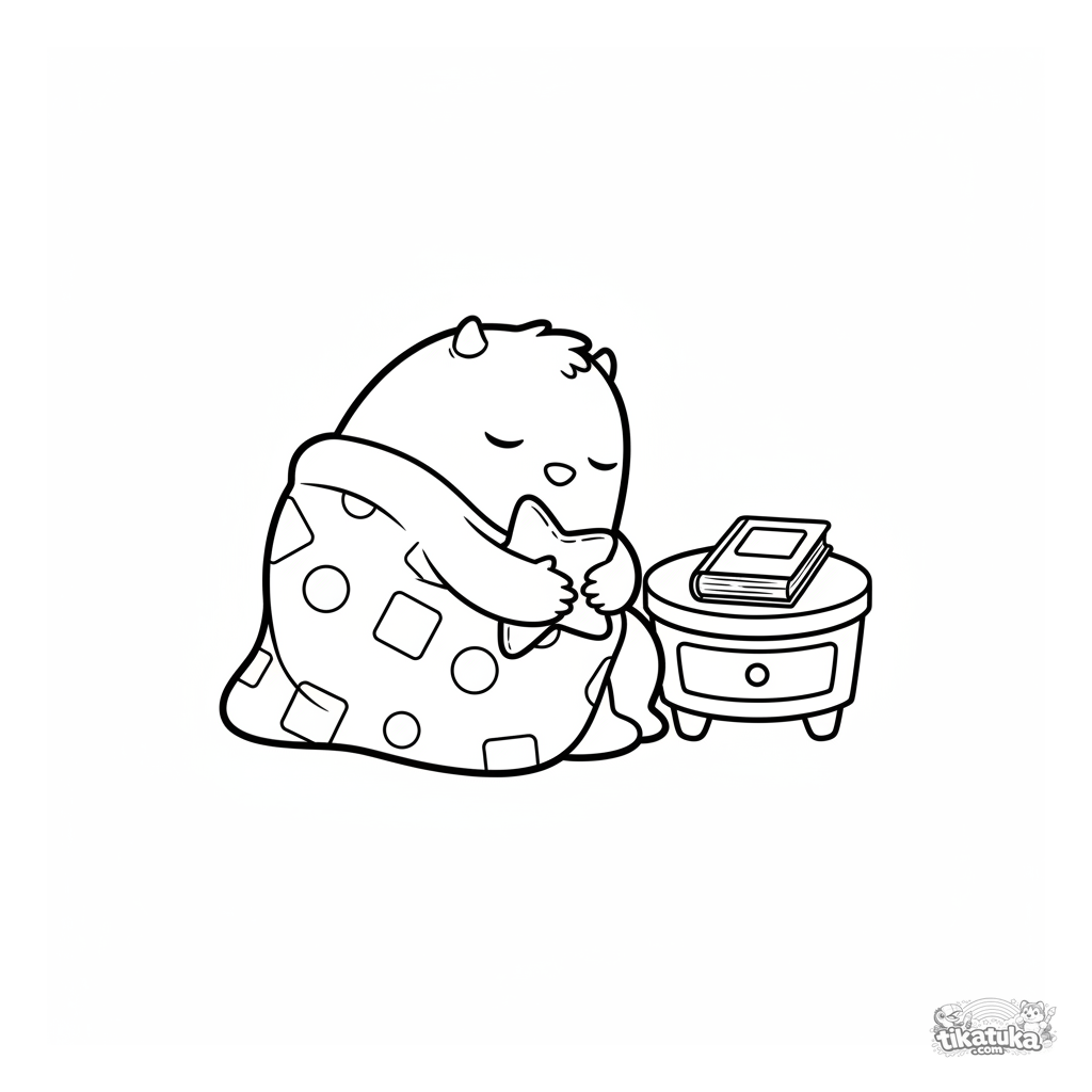 Página para colorir simples para crianças pequenas de 2-3 anos: um monstro em forma de pêra dormindo profundamente, abraçando um brinquedo.