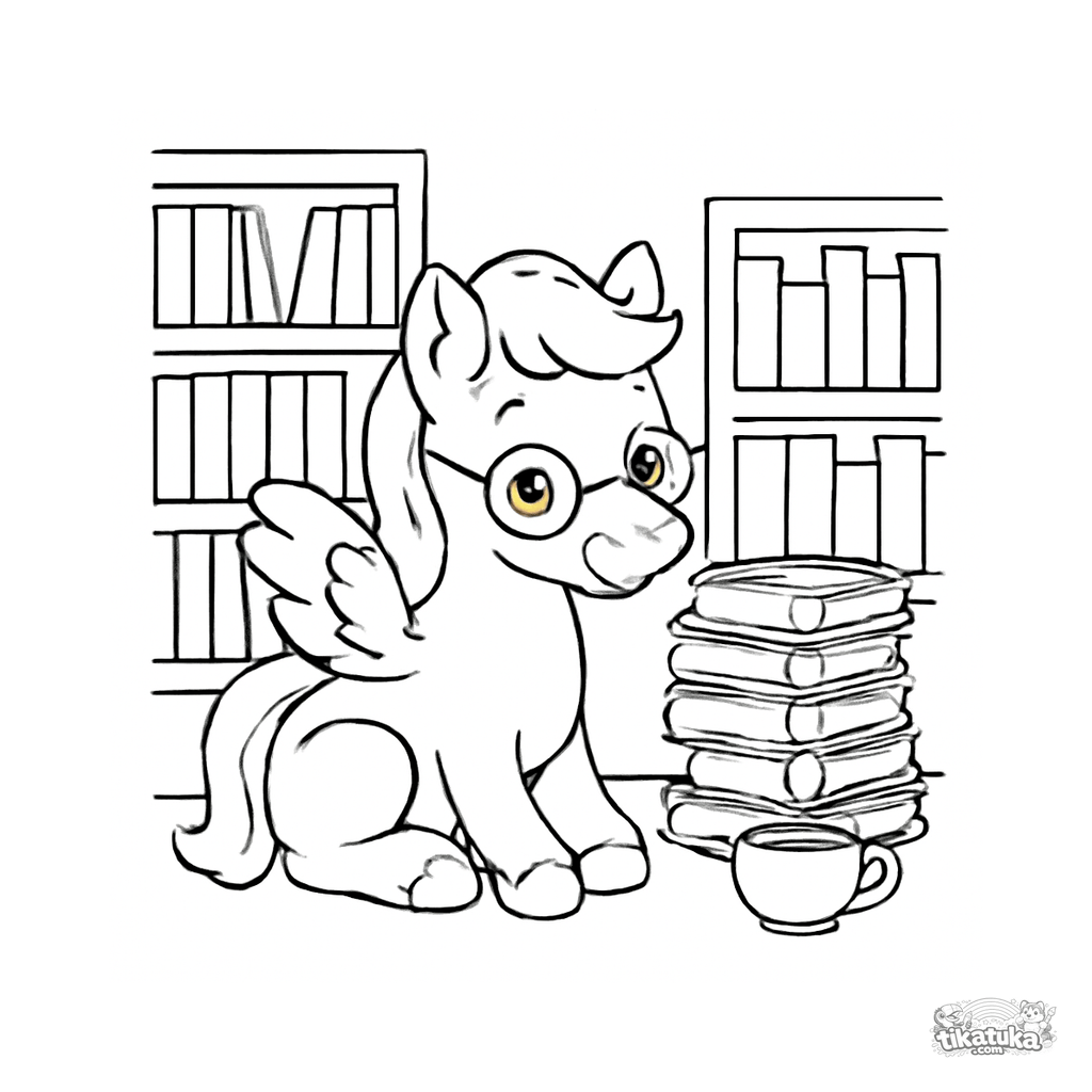 Página para colorir para crianças. Um pégaso bege gentil lendo em uma biblioteca aconchegante cercado de estantes, com chá e óculos. Download grátis.