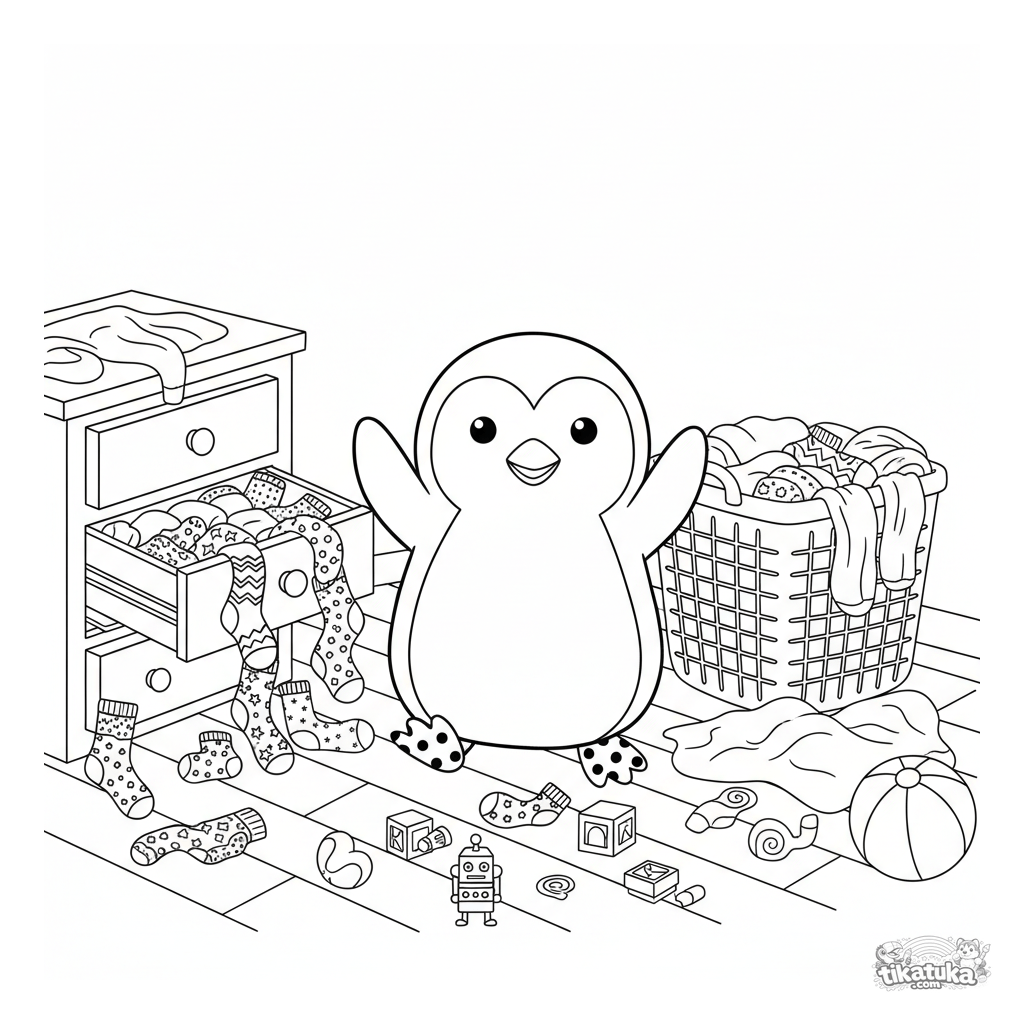 Página para colorir para crianças de 7 a 12 anos: um pinguim alegre celebra a vitória com meias desencontradas no meio de um quarto com roupas espalhadas. Cena engraçada e reconhecível.