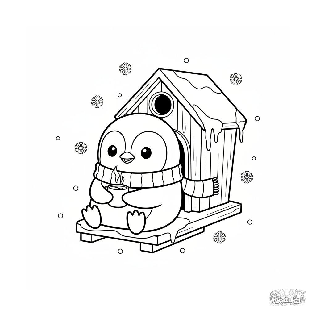 Página para colorir para crianças 4-6: um fofo pinguim com cachecol relaxa na varanda de uma casa de pássaros de inverno. Cena doce e simples no estilo chibi.