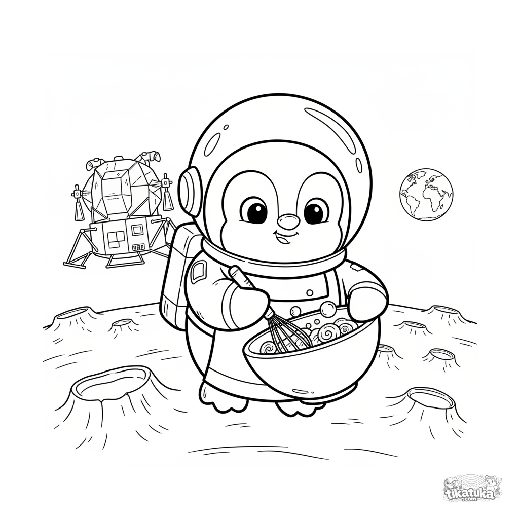 Página para colorir para crianças 4-6: o pinguim astronauta Marcel cozinha comida em gravidade zero na superfície da Lua. Design geométrico no estilo de brinquedo de madeira.
