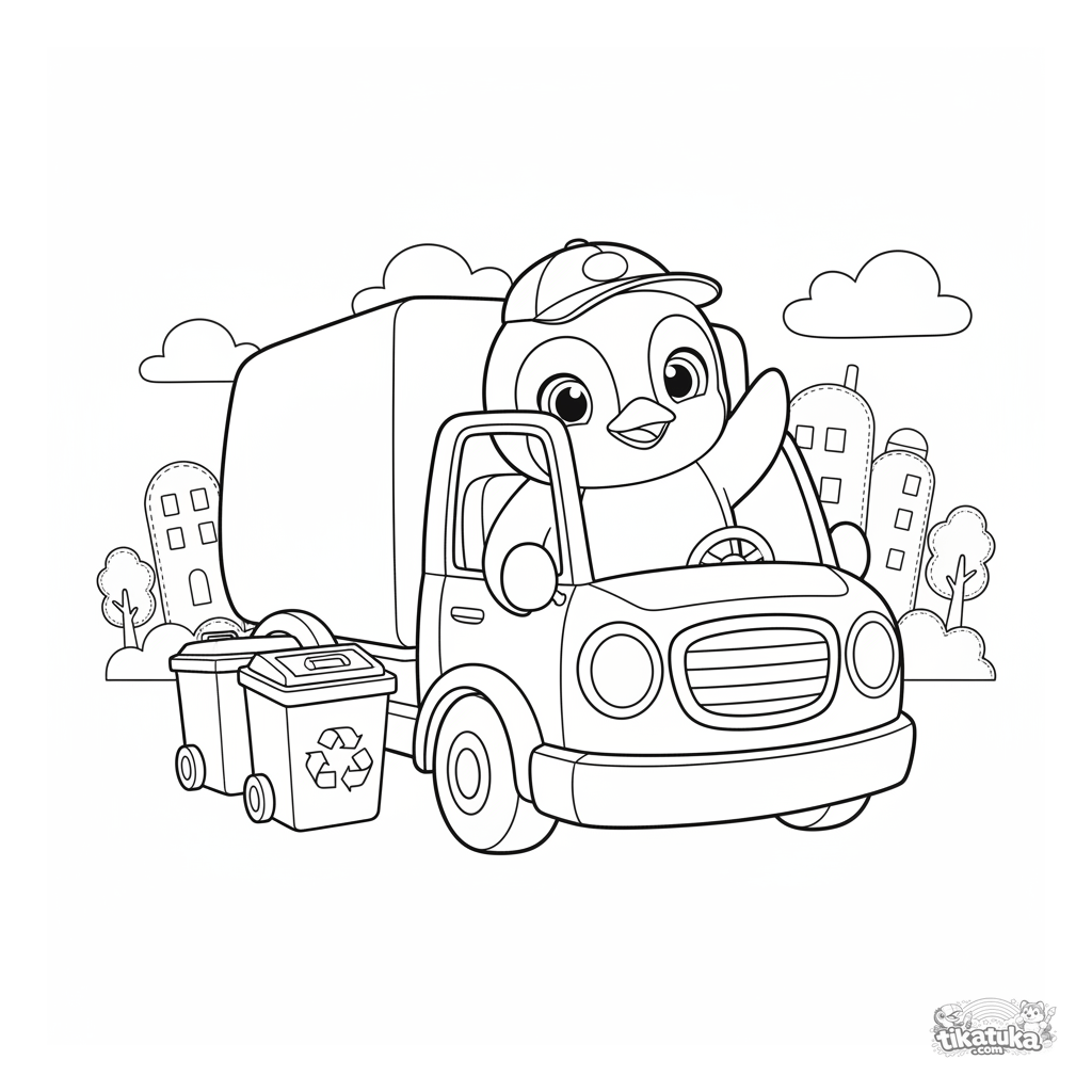 Página para colorir para meninos: o pinguim Marcel trabalhando como motorista de um caminhão de reciclagem alegre. Personagem amigável no estilo de boneco de pano.