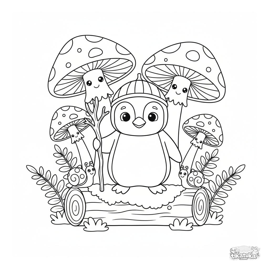 Página para colorir para crianças de 4-8 anos: o pinguim chef Marcel com capacete de bolota guarda cogumelos mágicos na floresta. Cena de conto de fadas.
