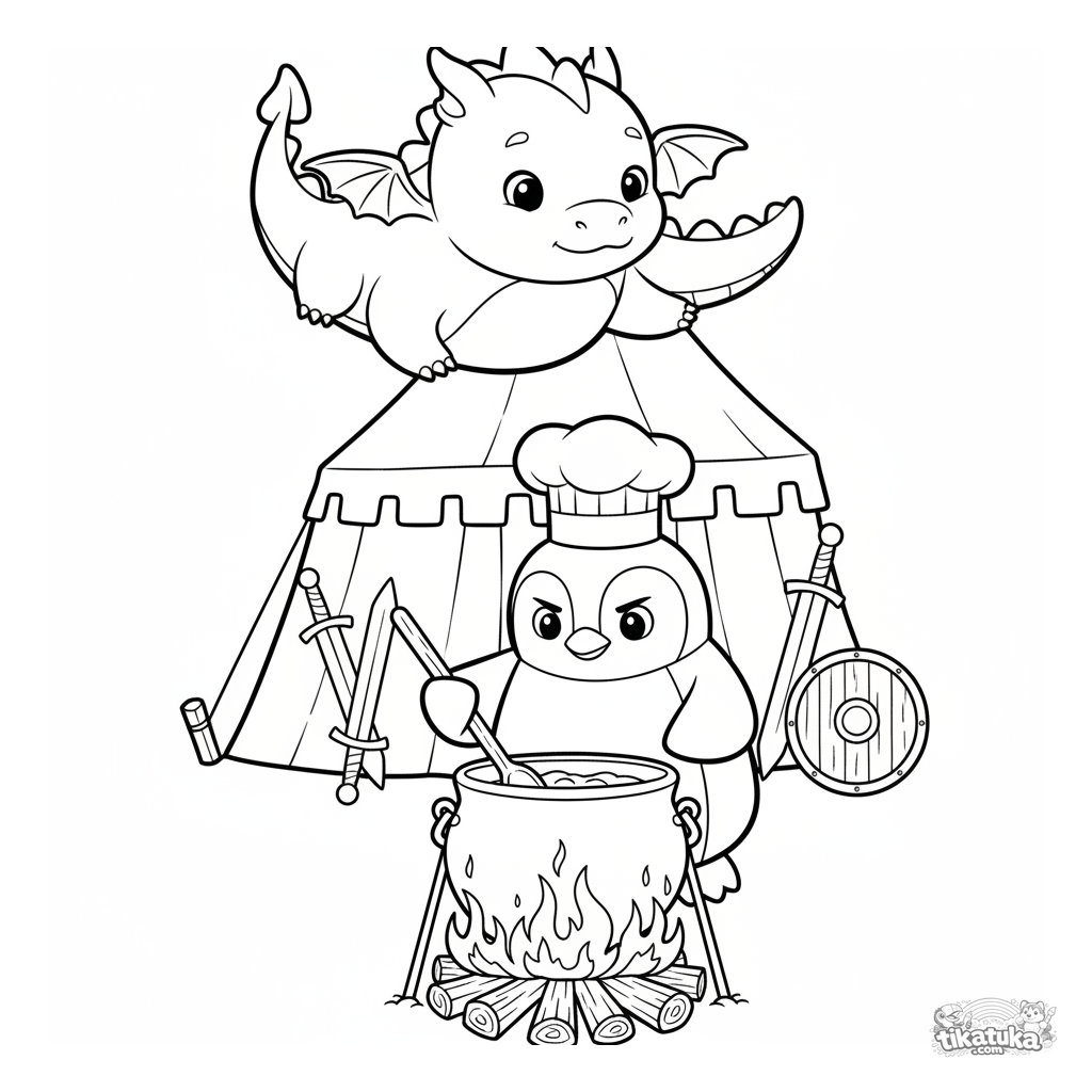 Página para colorir para meninos 4-6: o pinguim Marcel cozinha comida em um grande caldeirão em um acampamento de treino de cavaleiros. Formas geométricas no estilo de brinquedo de madeira.