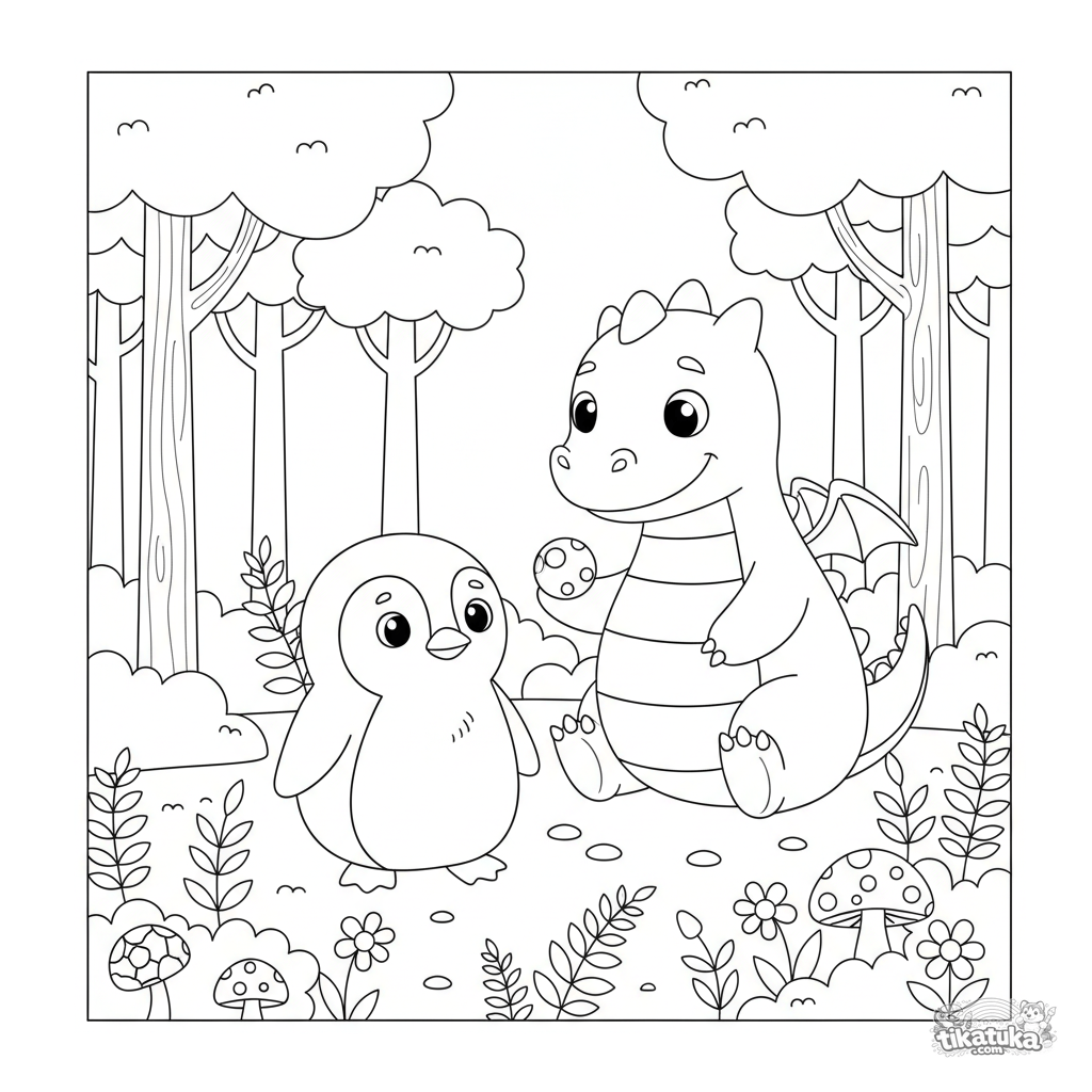 Página para colorir para crianças 4-6: o pinguim Marcel conhece um dragão de pelúcia amigável em uma clareira da floresta. Encontro fofo, detalhes naturais simples.