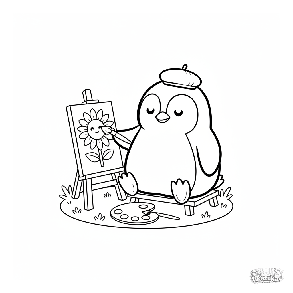 Página para colorir para crianças: o pinguim artista Marcel pintando um girassol brilhante. Cena criativa fofa no estilo de brinquedo de pelúcia.