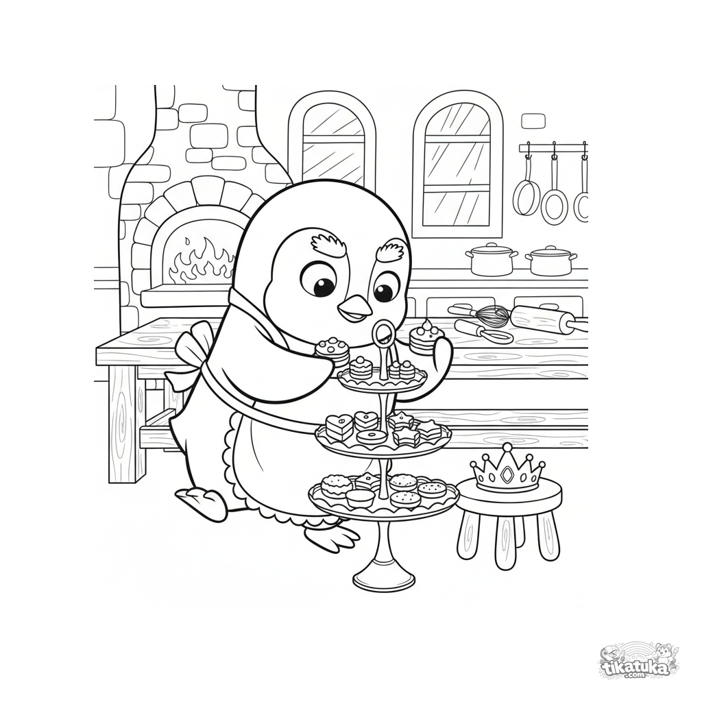 Página para colorir para meninas 4-6: o pinguim chef Marcel arruma doces para um chá da tarde real na cozinha de um castelo. Estilização de boneco de pano.