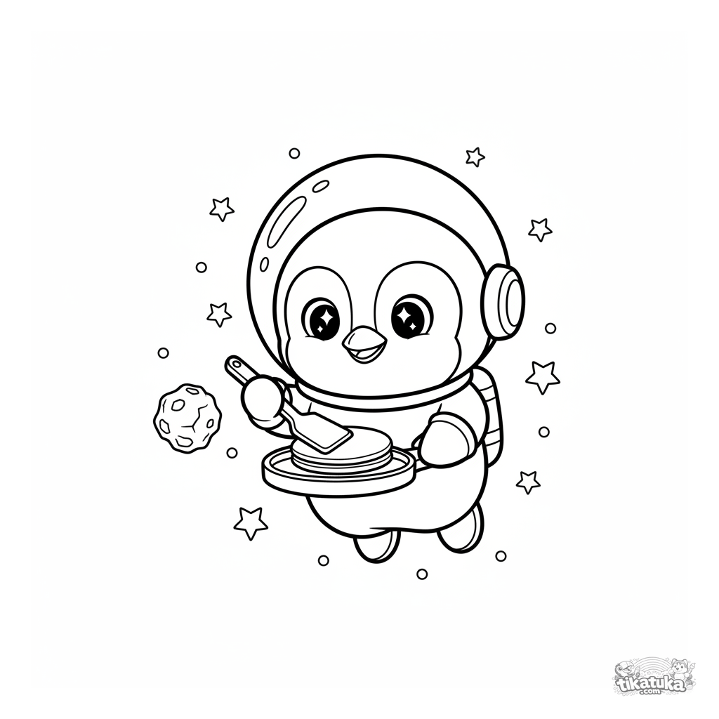 Página para colorir do Chef Pinguim Marcel cozinhando no espaço sideral. Para crianças de 4 a 6 anos. Cena divertida no estilo de mascote de pelúcia.