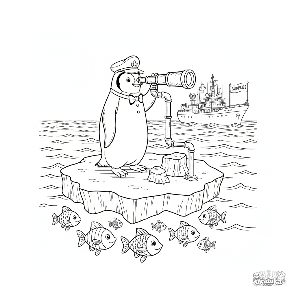 Página para colorir para crianças 10-12: um pinguim de chapéu de capitão em um iceberg com periscópio caseiro procura um navio de suprimentos. Cena engraçada detalhada em estilo de gravura vintage.