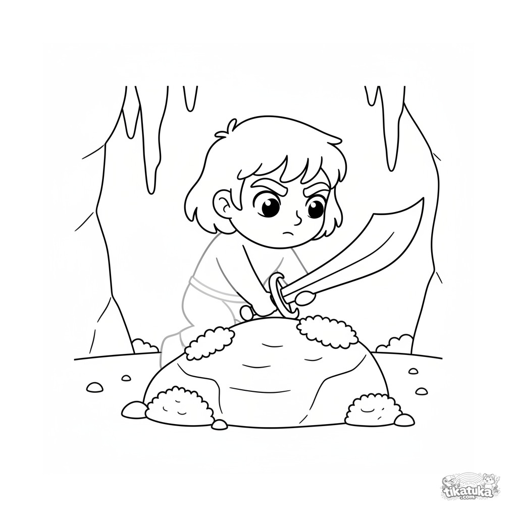 Página para colorir para crianças de 7-9 anos: o herói Perseu usa o Capuz da Escuridão para se esconder na toca de pedra da Medusa. Cena dinâmica do mito grego.