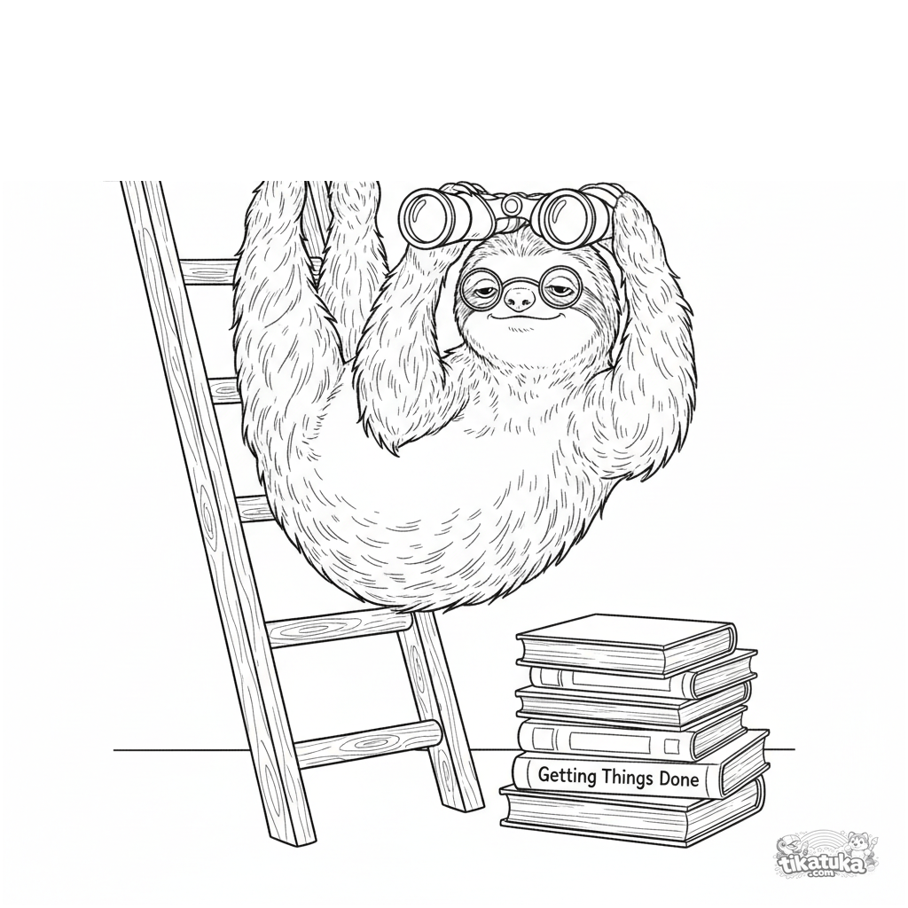Página para colorir para crianças 10-12: uma preguiça filosófica de óculos pendurada numa escada de biblioteca, olhando um livro de economia com binóculos.